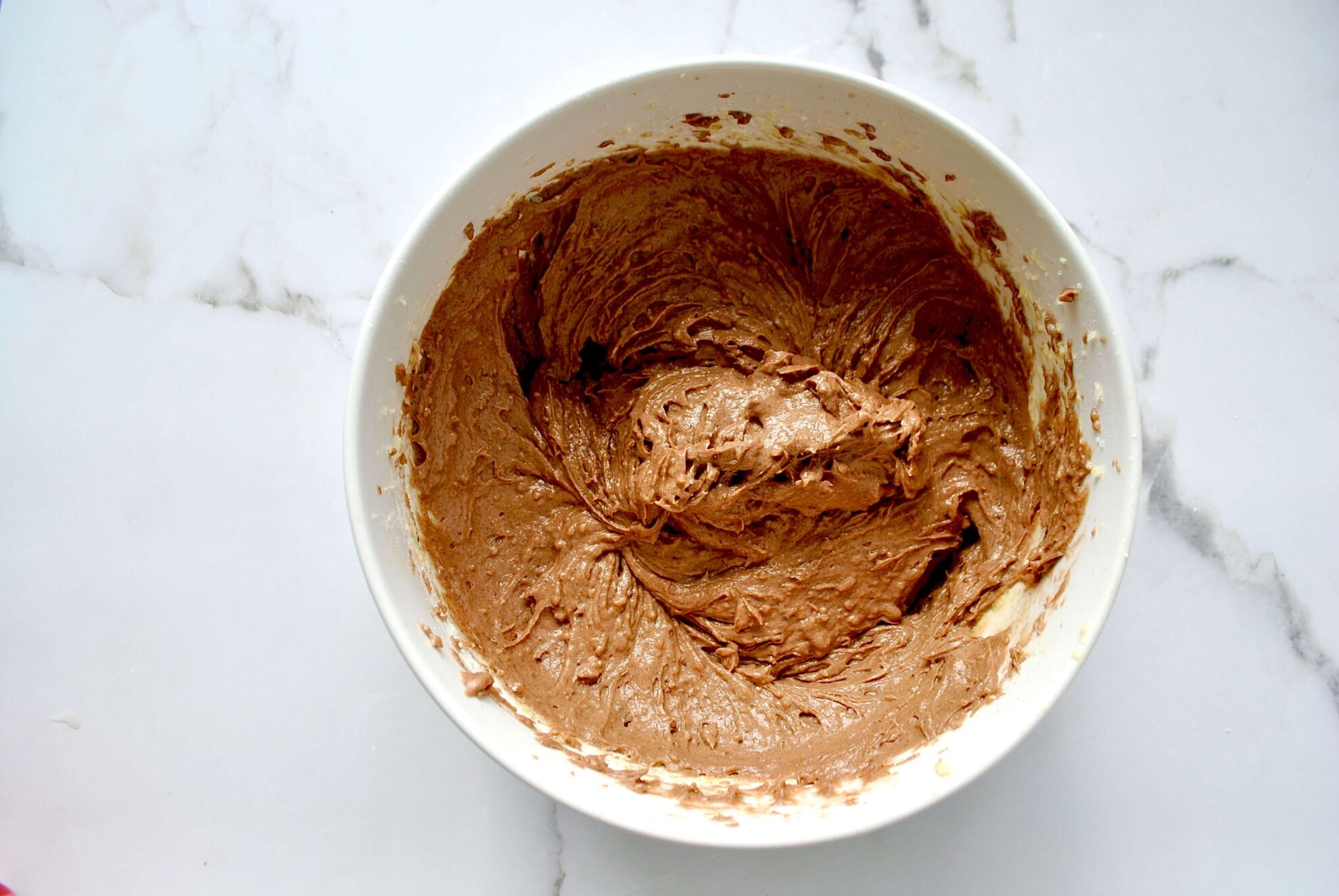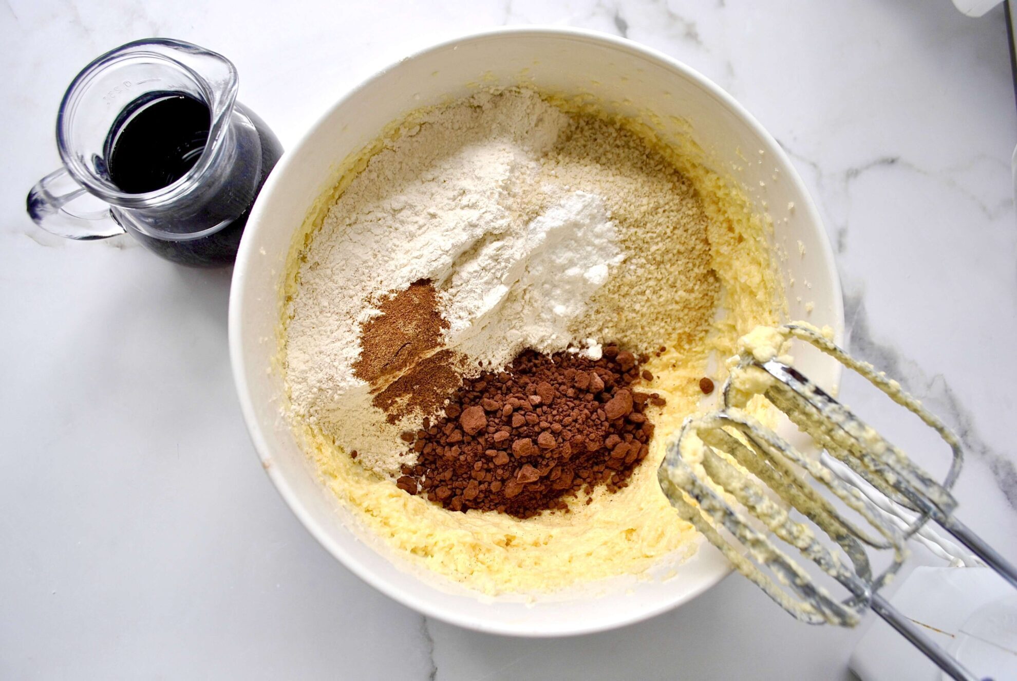 Nun geben wir alle trockenen Zutaten wie Mehl, Backpulver, gemahlene Mandeln, Backkakao, Salz und Lebkuchengewürz sowie der Glühwein zum Teig hinzu. Alles nur solange vermengen bis ein gleichmässiger Teig entsteht.