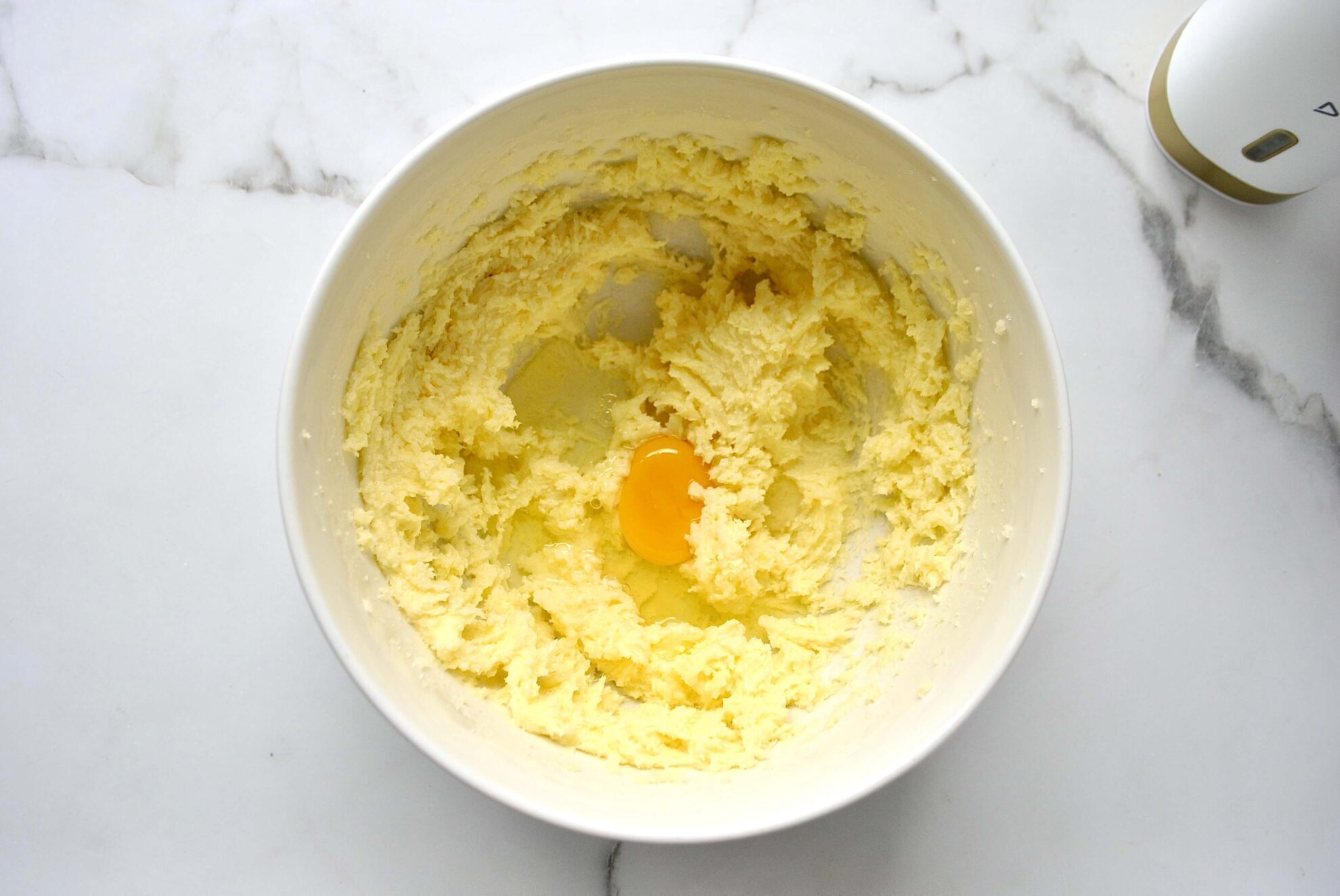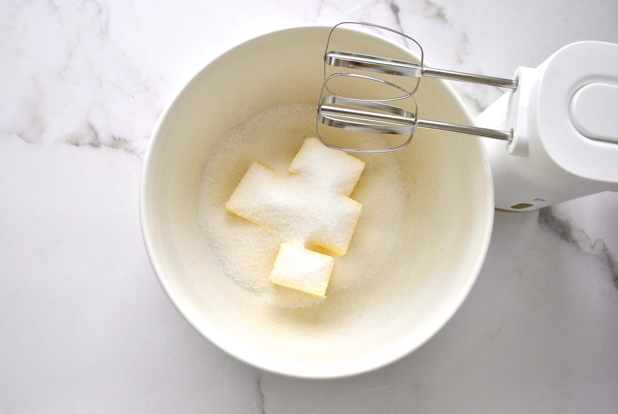In einer Rührschüssel vermengen wir erstmal die zimmerwarme Butter zusammen mit dem Zucker.