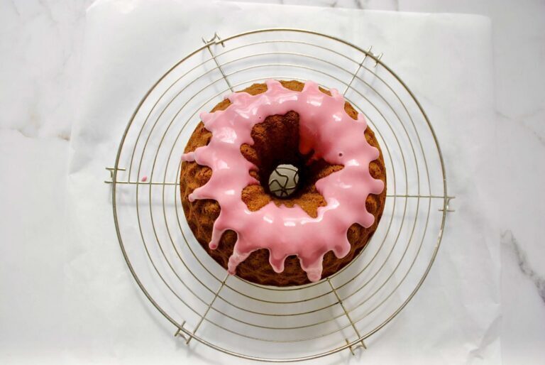 Sobald du den Kuchen auf das Kuchengitter gestürzt hast, kannst du den Zuckerguss über dem Kuchen verteilen und etwas antrocknen lassen.