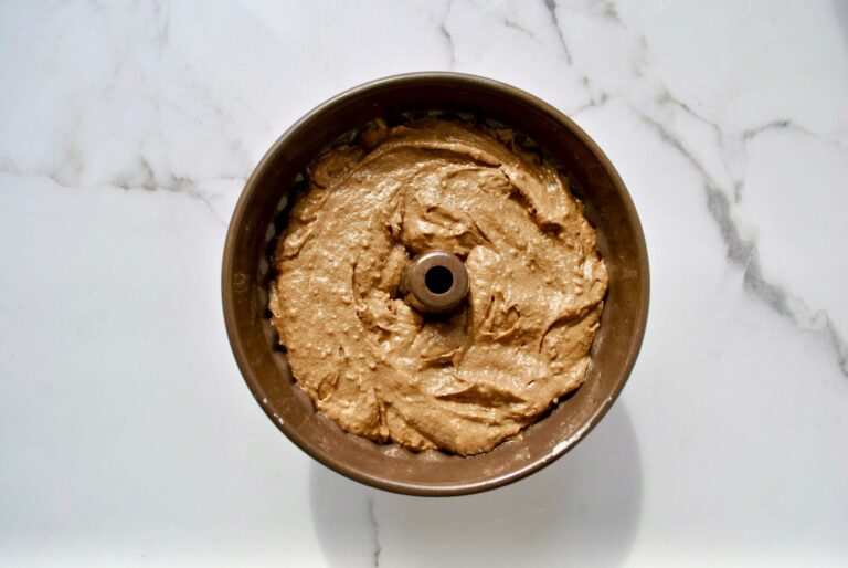 Danach gibst du etwas Mehl in die eingefettete Backform und schwenkst und klopfst das Mehl rundherum bis alles bemehlt ist. Das überschüssige Mehl kannst du einfach ausklopfen.