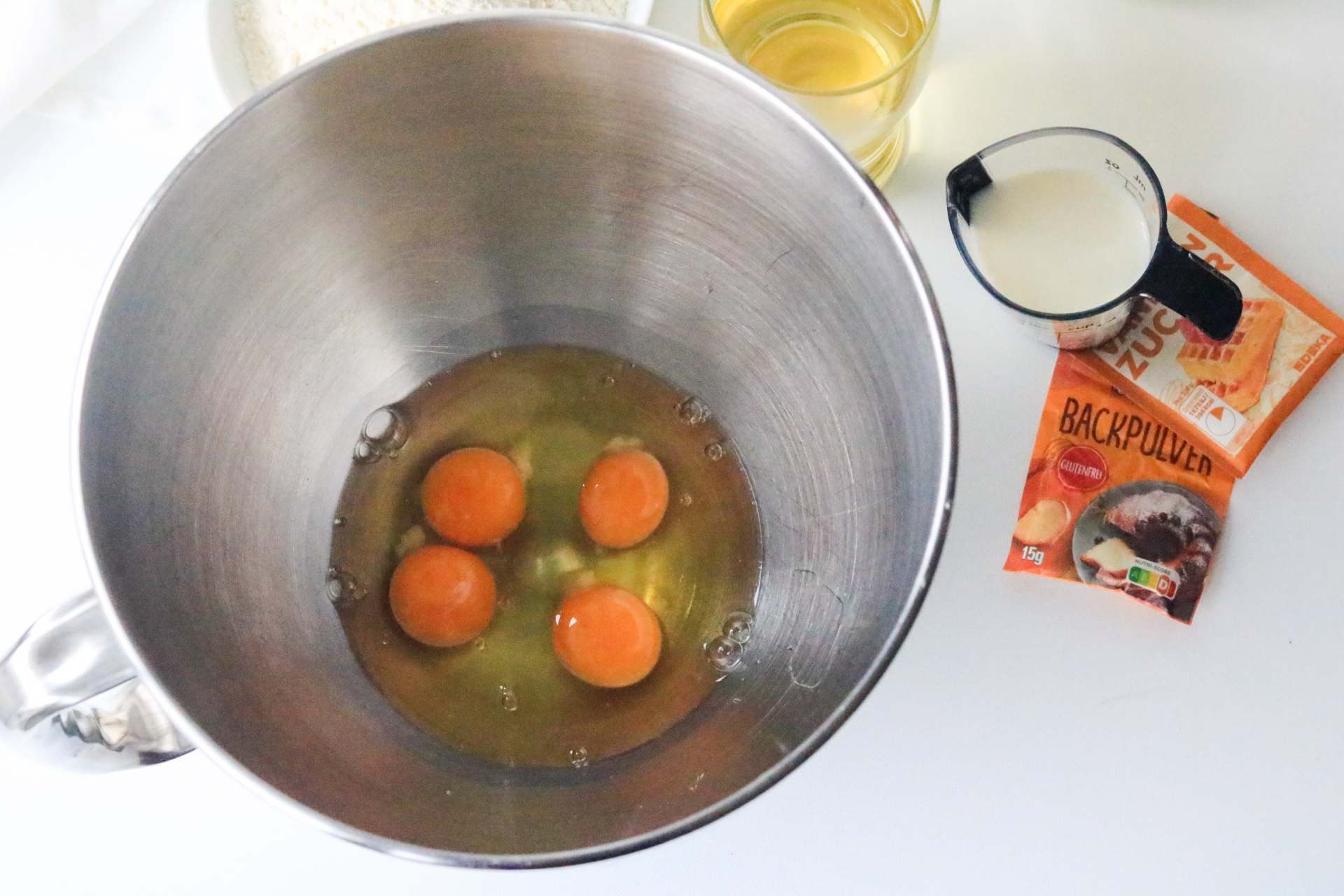 Dann den Zucker und Vanillezucker dazugeben und weiter schaumig schlagen. Das Öl dann kurz und zügig unterrühren.