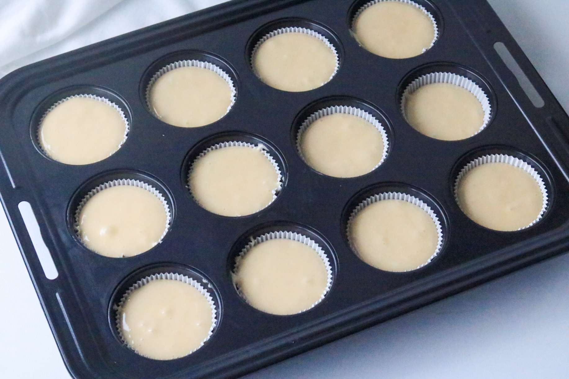 Das Muffinsblech mit den Muffinsförmchen auslegen und Teig einfüllen. Etwa 1 großer Esslöffel Teig pro Förmchen.