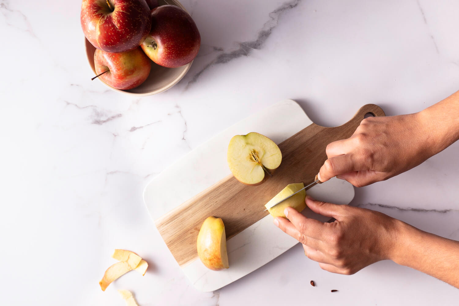 Kurz vor Ende der Gehzeit des Hefeteiges können wir schon einmal damit anfangen, die Äpfel für den Belag vorzubereiten. Hierfür die Äpfel vierteln, das Kerngehäuse entfernen und schälen.