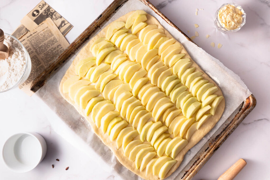 Du verteilst die Apfelscheiben dachziegelartig gleichmäßig auf dem ausgerollten Hefeteig.