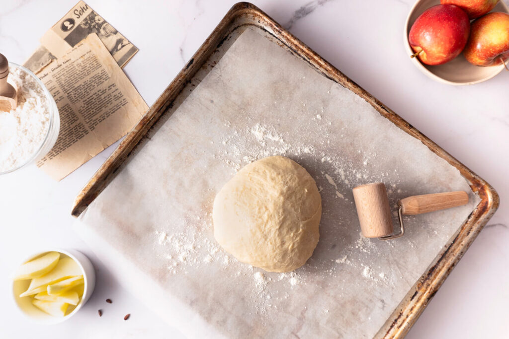Anschließend rollen wir den Hefeteig mit etwas Mehl auf die Größe des Bleches aus.