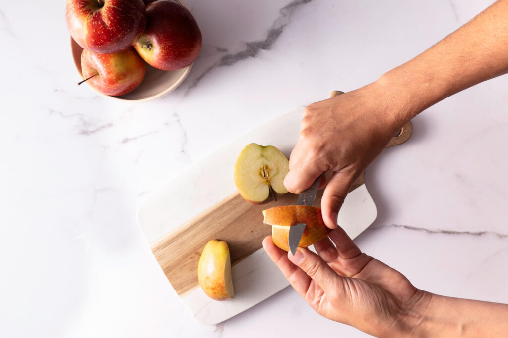 Die Apfelviertel in gleichmäßige Scheiben schneiden. Mit etwas Zitronensaft beträufeln, das verhindert, dass die Apfelscheiben braun werden.