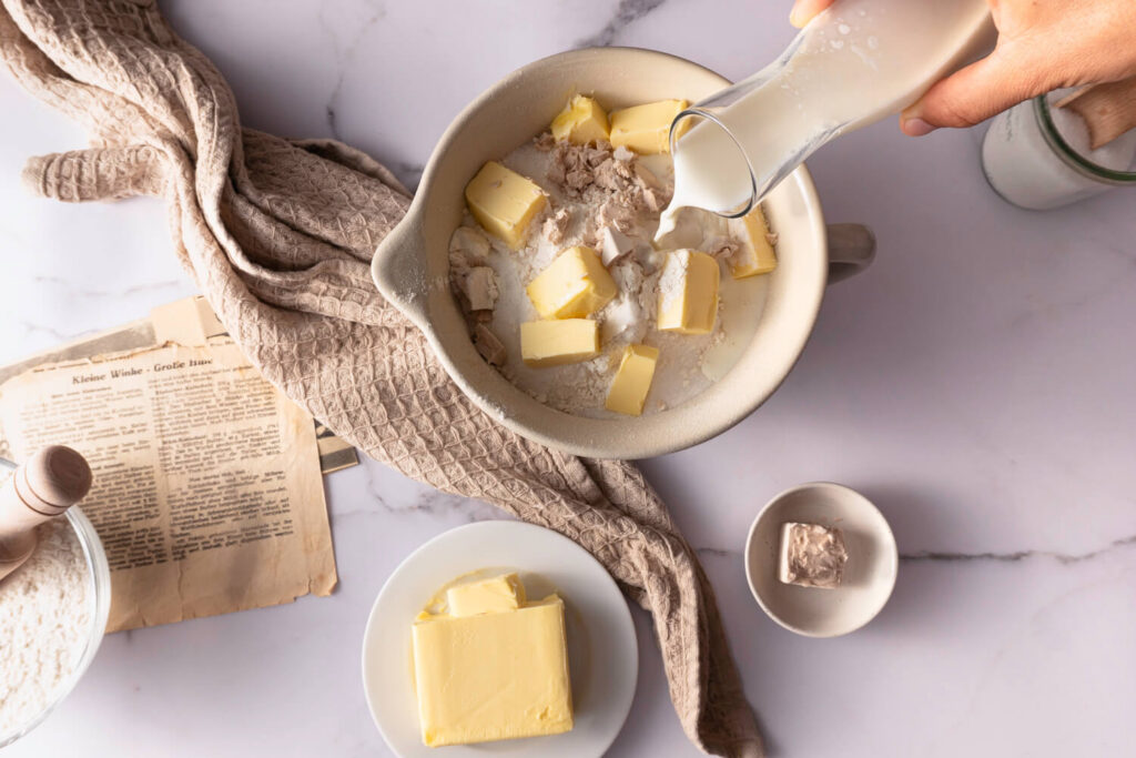 Füge nun die Milch hinzu. Wenn es mal schneller gehen soll: du kannst auch lauwarme Milch verwenden. Achte hierbei aber darauf, dass die Milch nicht wärmer als 40°C ist, denn sonst geht deine Hefe kaputt. Alternativ kannst du deinen Teig auch im Backofen bei 40°C gehen lassen.