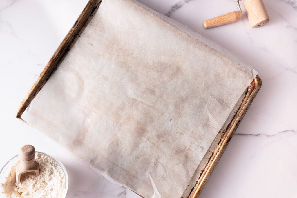 Nun belegen wir ein Blech mit Backpapier und heizen den Backofen auf 190°C Ober-/Unterhitze vor.