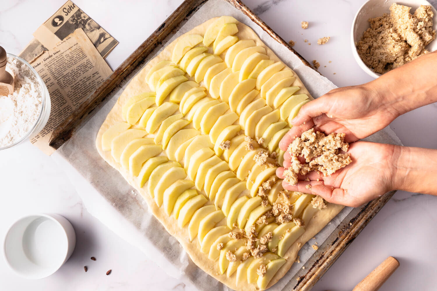 Nimm die Streusel aus dem Kühlschrank und verteile sie mit den Händen gleichmäßig auf den Apfelscheiben.