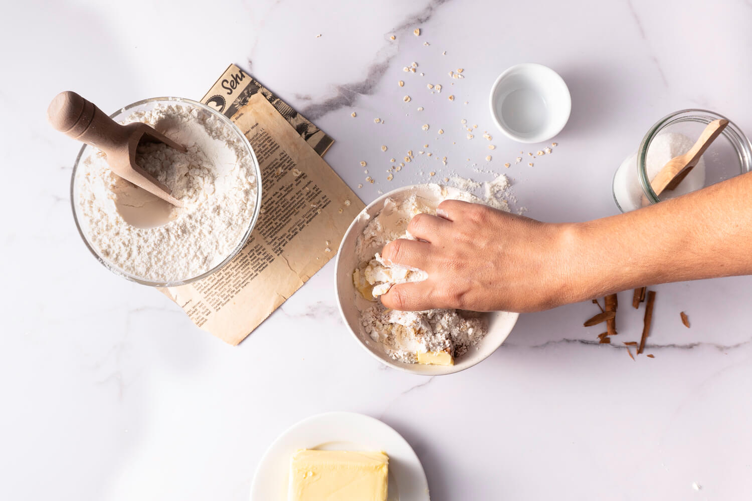 Nun werden alle Zutaten für die Streusel mit Haferflocken zügig mit der Hand zu einem Teig verknetet.