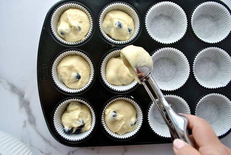 Den Teig nun gleichmäßig mit dem Eisportionierer oder zwei Teelöffel in die vorbereiteten Muffin Förmchen füllen und anschließend bei 180 Grad Umluft für ca. 20 Minuten backen.