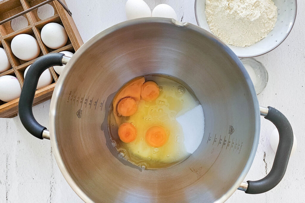 Gib die Eier zusammen mit Zucker und einer Prise Salz in eine große Rührschüssel und schlage sie mit hoher Geschwindigkeit auf – mindestens 8 bis 10 Minuten. Die Masse soll dabei hell, dicklich und deutlich voluminös werden.
