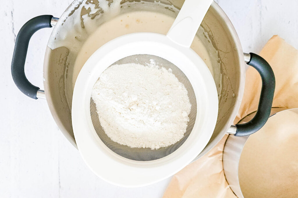 Nachdem deine Eiermasse perfekt aufgeschlagen ist, folgt der heikelste – aber ebenso entscheidende – Schritt: das Einarbeiten des Mehls, ohne die eingeschlossene Luft wieder zu verlieren. Siebe das abgewogene Mehl in drei Portionen über die aufgeschlagene Masse. Nimm dir für jede Portion einen Moment Zeit und hebe sie ganz behutsam mit einem Teigschaber unter.