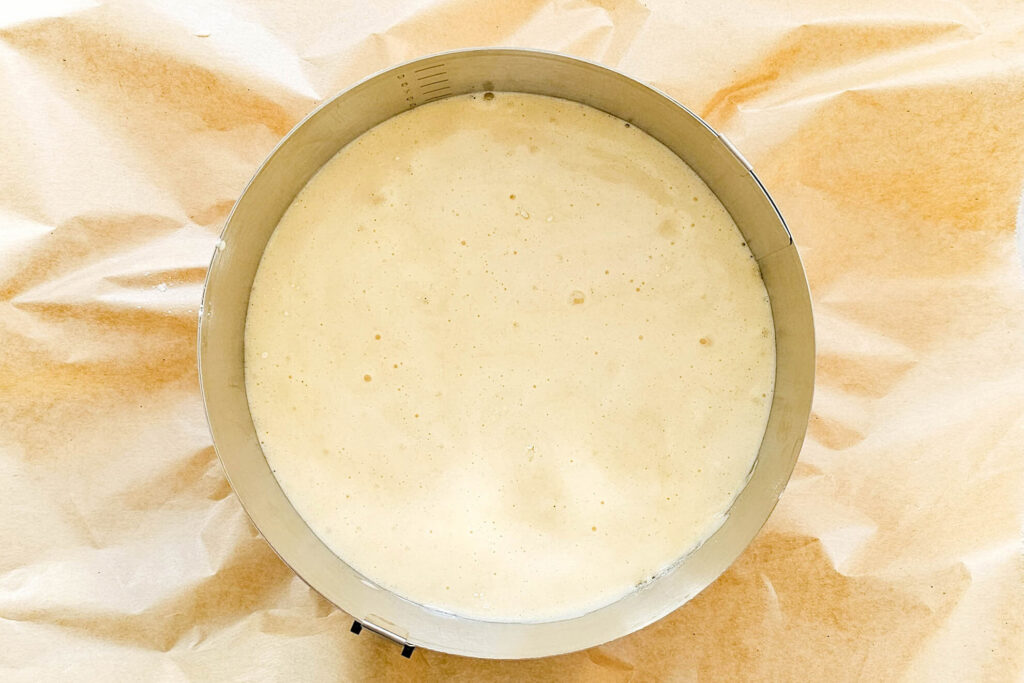 Fülle den fertigen Teig zügig in die vorbereitete Springform und streiche ihn glatt. Schiebe die Form sofort in den Ofen – und halte während der gesamten Backzeit die Ofentür geschlossen, damit der Biskuit gleichmäßig aufgeht.