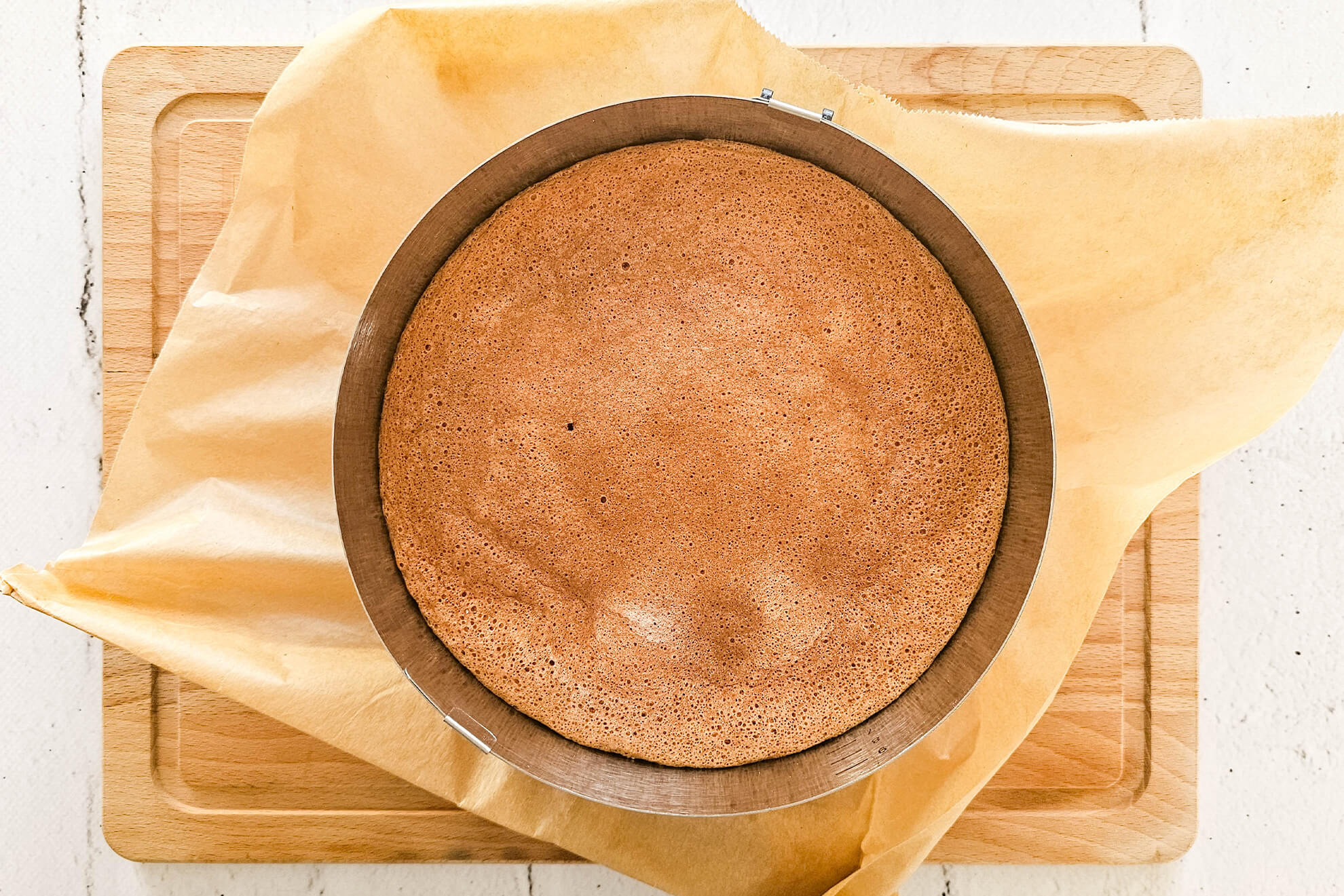 Lege dir dafür ein großes Stück Backpapier auf die Arbeitsfläche oder ein Kuchengitter und stürze den heißen Biskuitboden kopfüber darauf. Klingt erst mal ungewohnt? Funktioniert aber großartig: Durch das Eigengewicht drückt sich die Oberfläche ganz natürlich glatt – so bekommst du einen ebenen Boden, der sich später perfekt füllen und stapeln lässt.