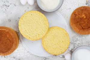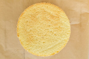 Nimm den Biskuit direkt nach dem Backen aus der Form und stürze ihn kopfüber auf ein mit Backpapier belegtes Gitter. Vollständig auskühlen lassen, dann in Frischhaltefolie wickeln und idealerweise über Nacht ruhen lassen – so lässt er sich am nächsten Tag sauber und gleichmäßig schneiden.