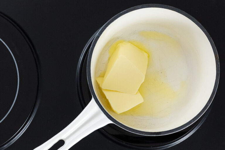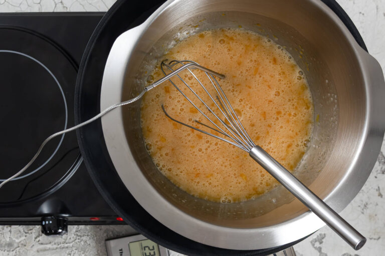 Bevor du mit der Eiermasse beginnst, schmilz zuerst die Butter bei niedriger Hitze und stell sie anschließend zur Seite. Sie sollte beim späteren Unterheben flüssig, aber nicht mehr heiß sein – so lässt sie sich am besten einarbeiten, ohne die Luftigkeit der Masse zu zerstören.