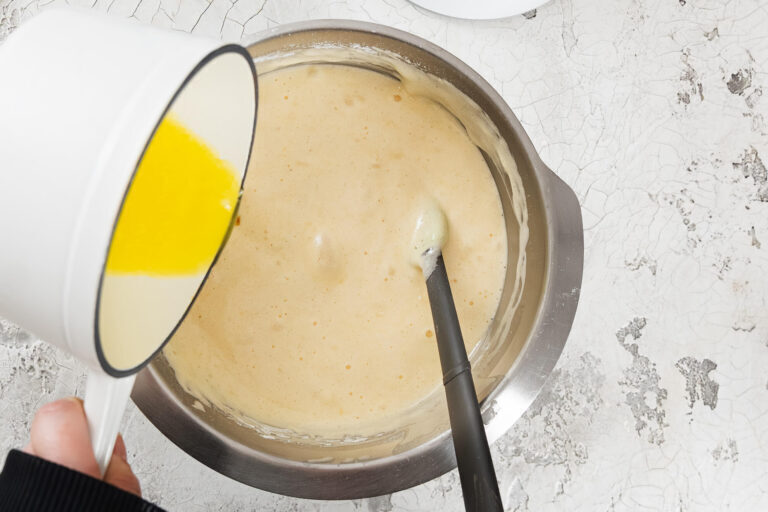 Jetzt kommt die vorbereitete Butter zum Einsatz. Sie sollte noch flüssig, aber nur noch lauwarm sein. Gieße sie am besten in einem dünnen Strahl an den Rand der Schüssel und hebe sie behutsam unter die Masse. So verhinderst du, dass die luftige Struktur zusammenfällt, und erhältst einen schön saftigen Boden mit perfekter Textur.