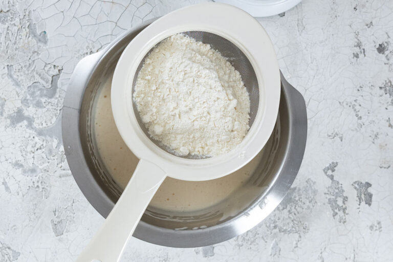 Sieb nun das Mehl direkt in die aufgeschlagene Eiermasse – das verhindert Klümpchen und sorgt für eine gleichmäßige Verteilung. Hebe das Mehl mit einem Teigspatel vorsichtig, aber gründlich unter. Nimm dir dabei Zeit, damit die Luft in der Masse erhalten bleibt.