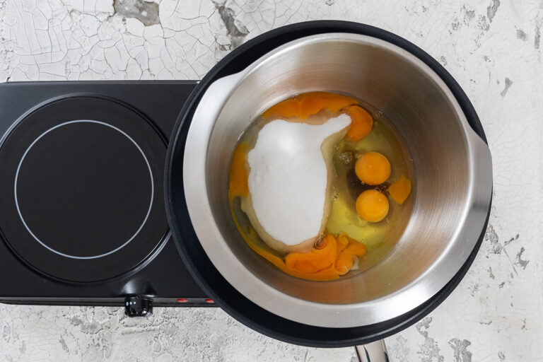 Jetzt bereitest du dein Wasserbad vor. Erhitze dazu etwas Wasser in einem Topf und stelle eine hitzebeständige Schüssel (am besten aus Edelstahl) so darauf, dass sie das Wasser nicht direkt berührt. Gib nun die Eier, den Zucker, das Vanillekonzentrat und eine Prise Salz in die Schüssel. Erwärme die Masse unter ständigem Rühren auf etwa 45 °C – dadurch wird sie stabiler und lässt sich später besonders voluminös aufschlagen.