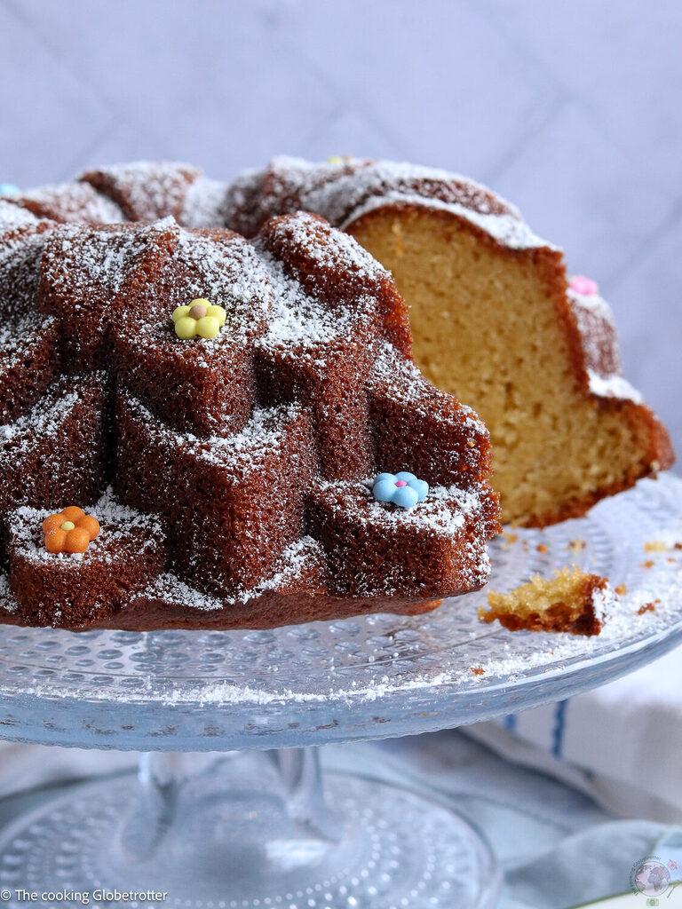 Puder Zucker darüber macht ihn nicht nur total hübsch, sondern hilft auch wenn der Kuchen nicht ganz sauber aus der Form rausgekommen ist. Das ist mir einmal passiert: er ist in viele Teilen zerbrochen, weil ich nicht gewartet habe bis er ausgekühlt war. Aber mit Puderzucker konnte ich den Unfall gut kaschieren!