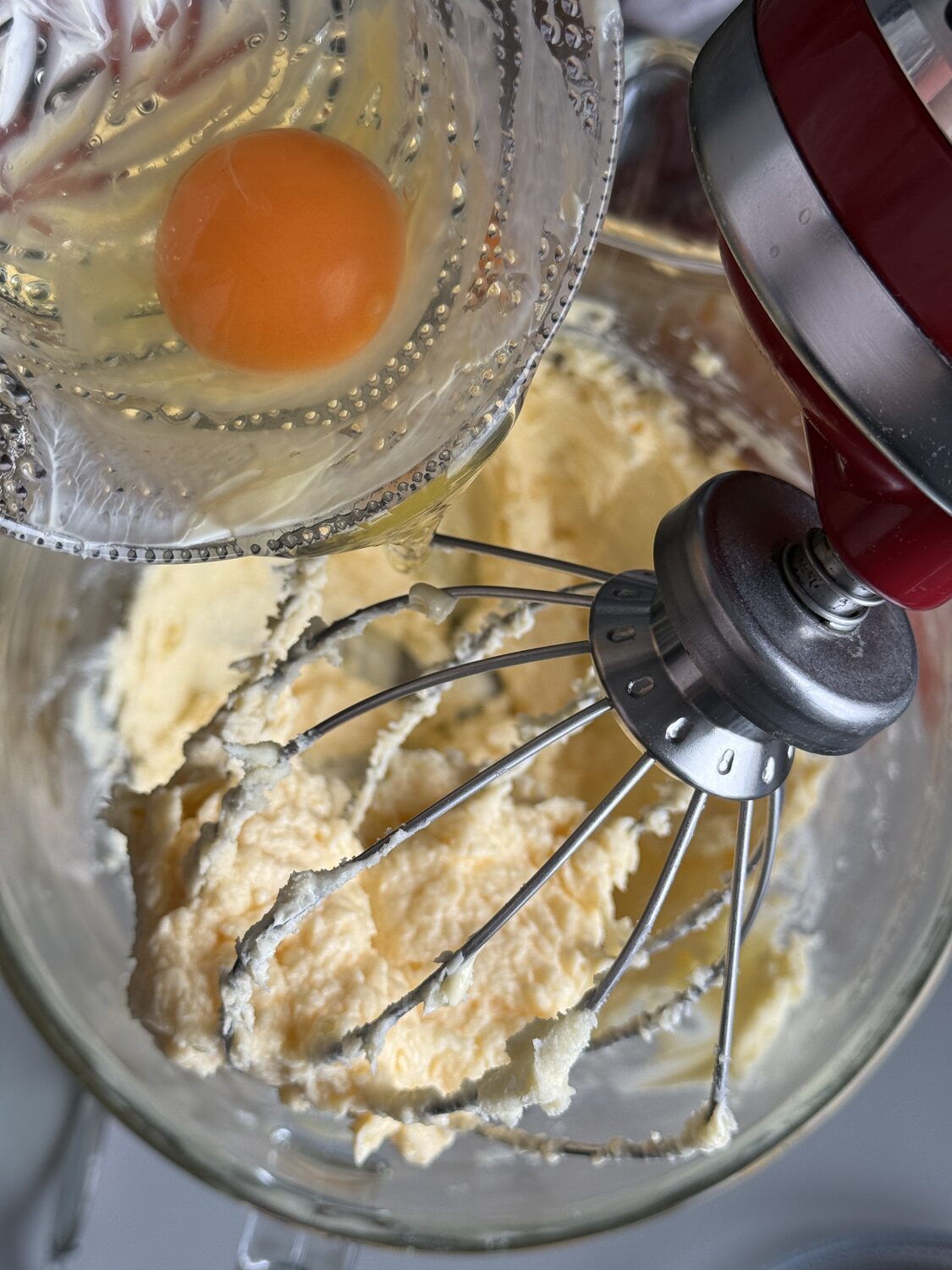 Die Eier gibts du eines nach dem anderen dazu und vermischst alles gut, bevor du das nächste dazugibst.
