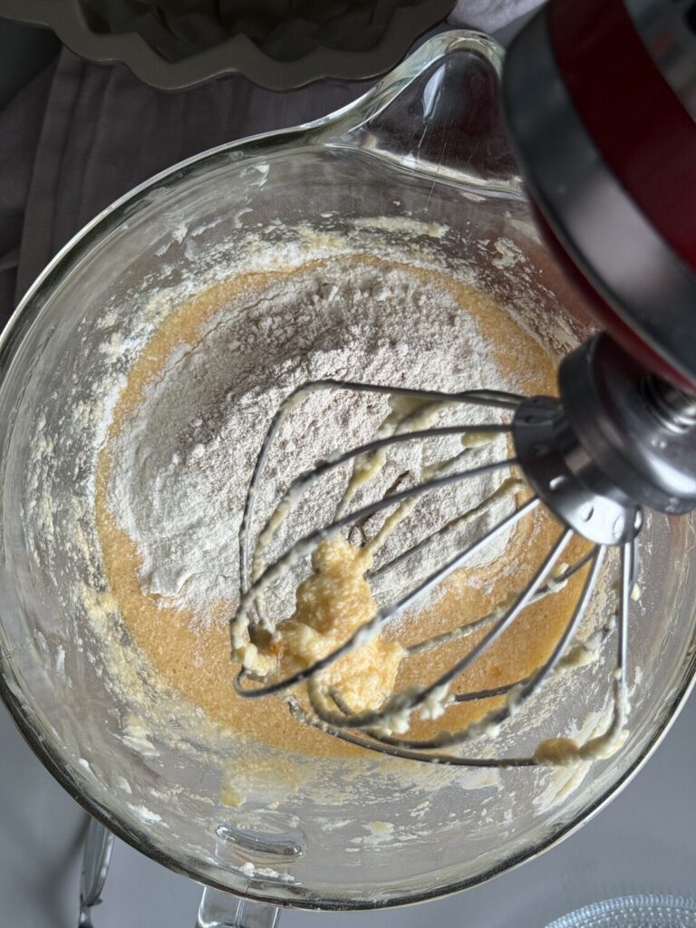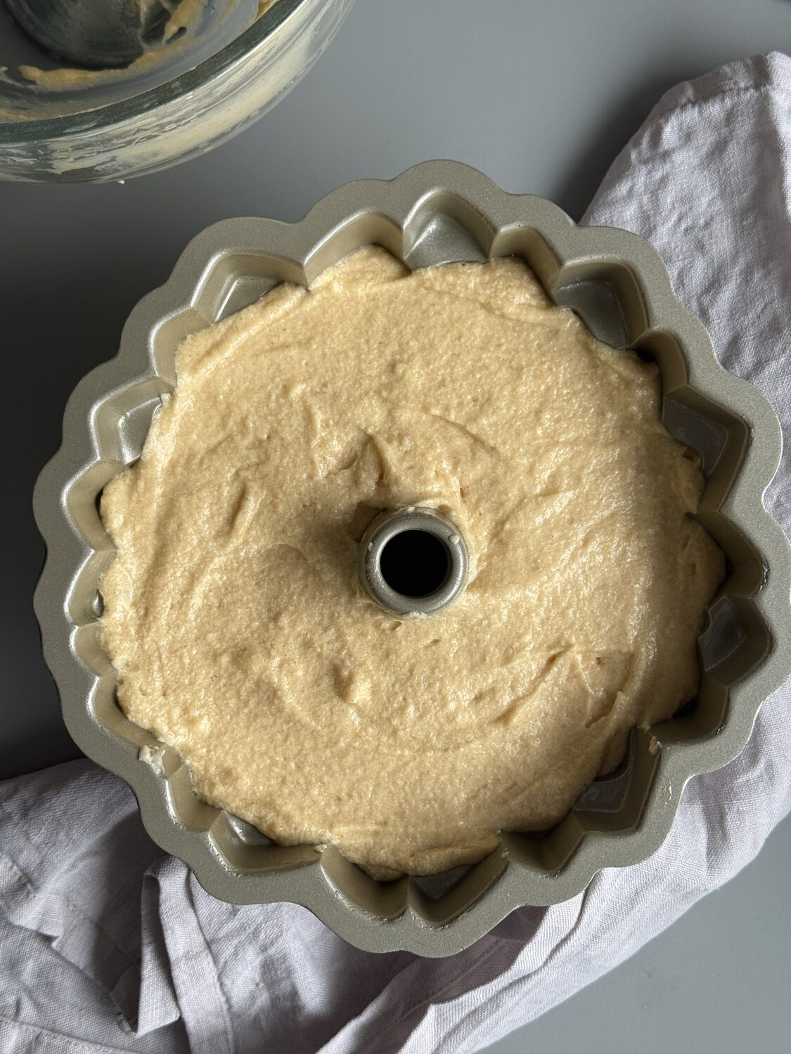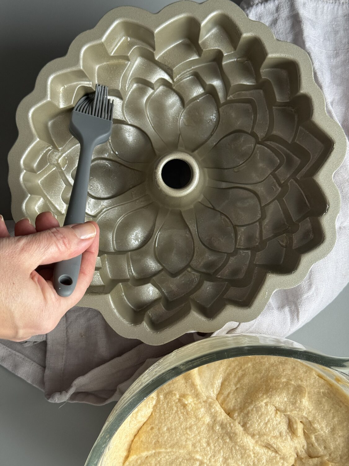 Die Gugelhupf Form kannst du mit geschmolzener Butter und einem Pinsel einfetten oder mit Backspray besprühen.