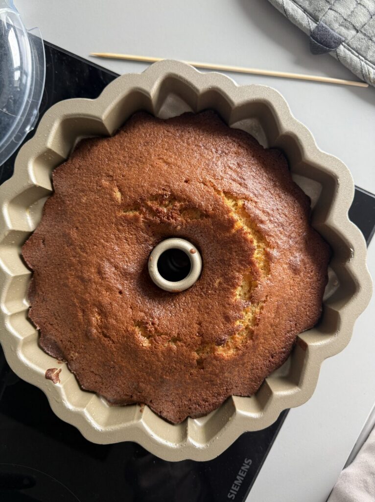 Nach 40 Minuten kannst du eine Stäbchen-Probe machen um zu überprüfen, ob der Kuchen auch in der Mitte durchgegart ist. Der Kuchen soll braun-gold sein, wie im Bild.