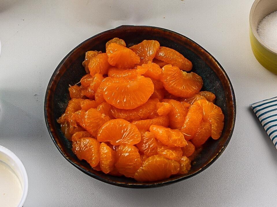 Lege Dir Deine Zutaten zurecht und gib die Mandarinen in ein Sieb zum Abtropfen.