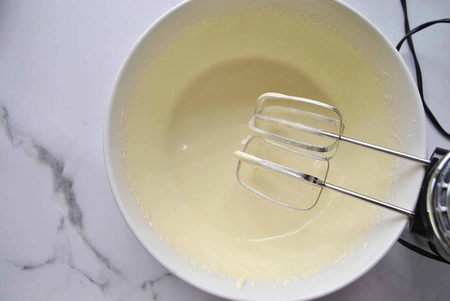 Trenne zuerst die Eier. Anschließend machen wir uns an die Zubereitung der Eigelbmasse. Dazu gibst du das Eigelb, zusammen mit dem Zucker und dem heißen Wasser in eine Rührschüssel und schlägst alles zusammen kräftig für ca. 5 Minuten schaumig auf.