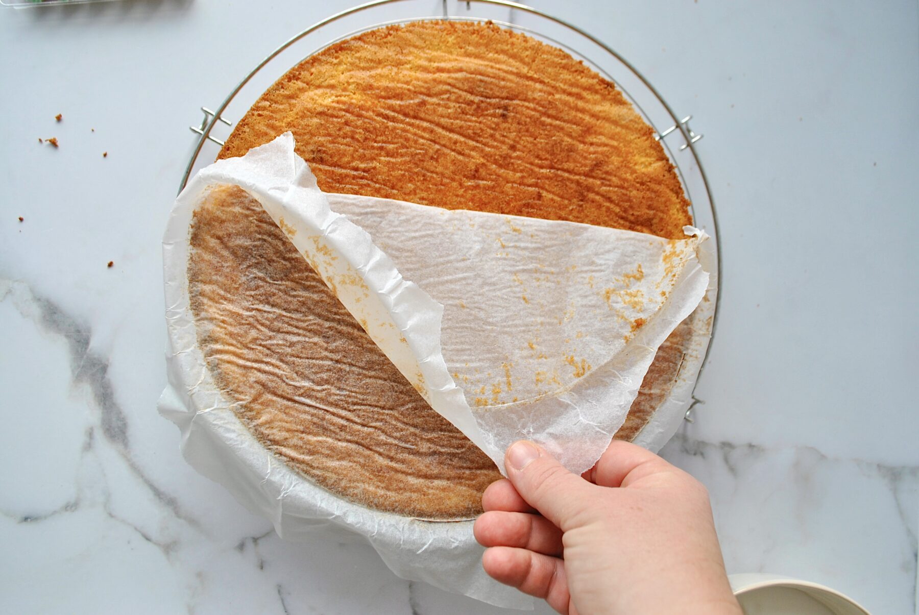 Nun kannst du vorsichtig das Backpapier vom Karottenkuchen ablösen.