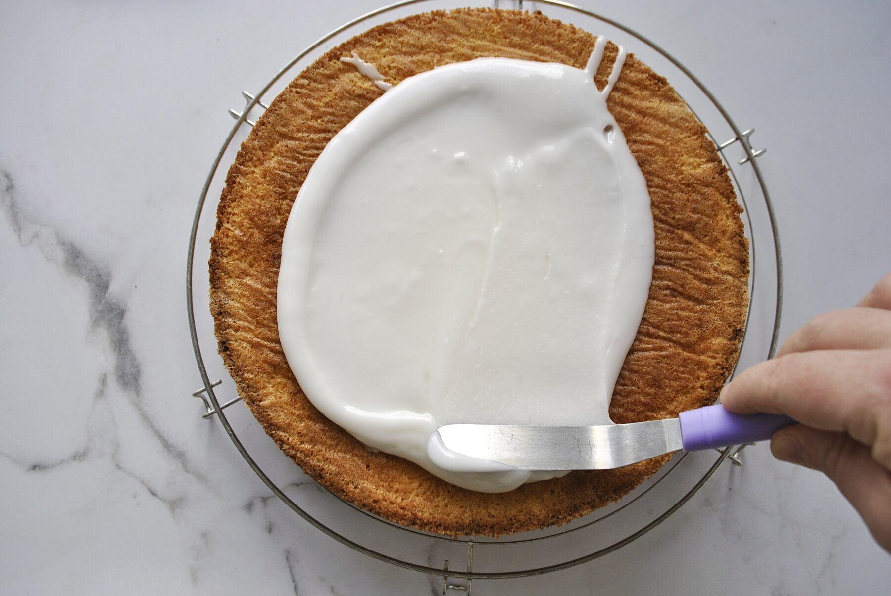 Den Zuckerguss auf den Rüblikuchen giessen und mit einem Spachtel oder einem Löffel auf der Torte verteilen. Lass den Guss auch etwas über den Rand fliessen für eine schöne Optik.