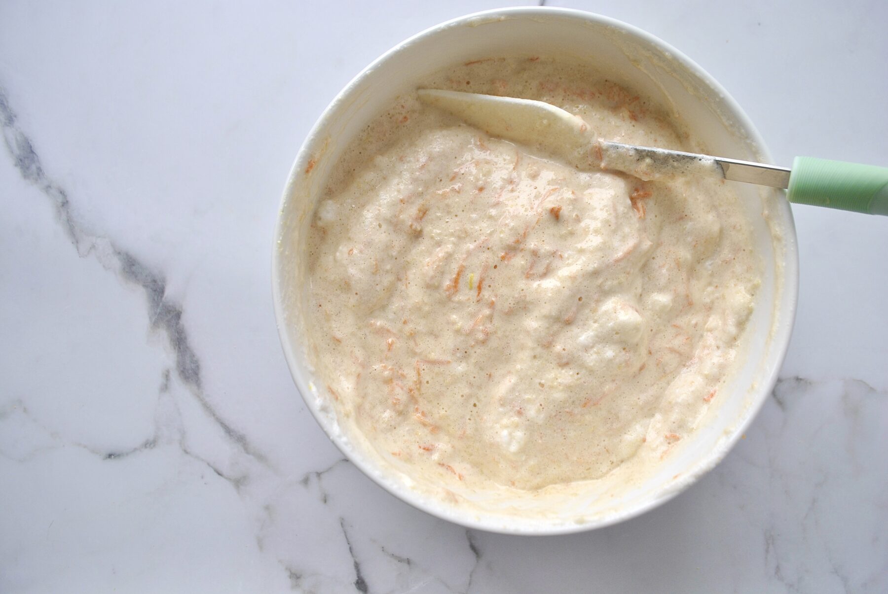 Danach raspelst du die Karotten fein und gibst sie zusammen mit der Maisstärke, Backpulver, den gemahlenen Mandeln, dem Zitronenabrieb und Saft (2 EL zur Seite stellen für den Zuckerguss) zur Eigelbmasse und hebst alles vorsichtig unter.