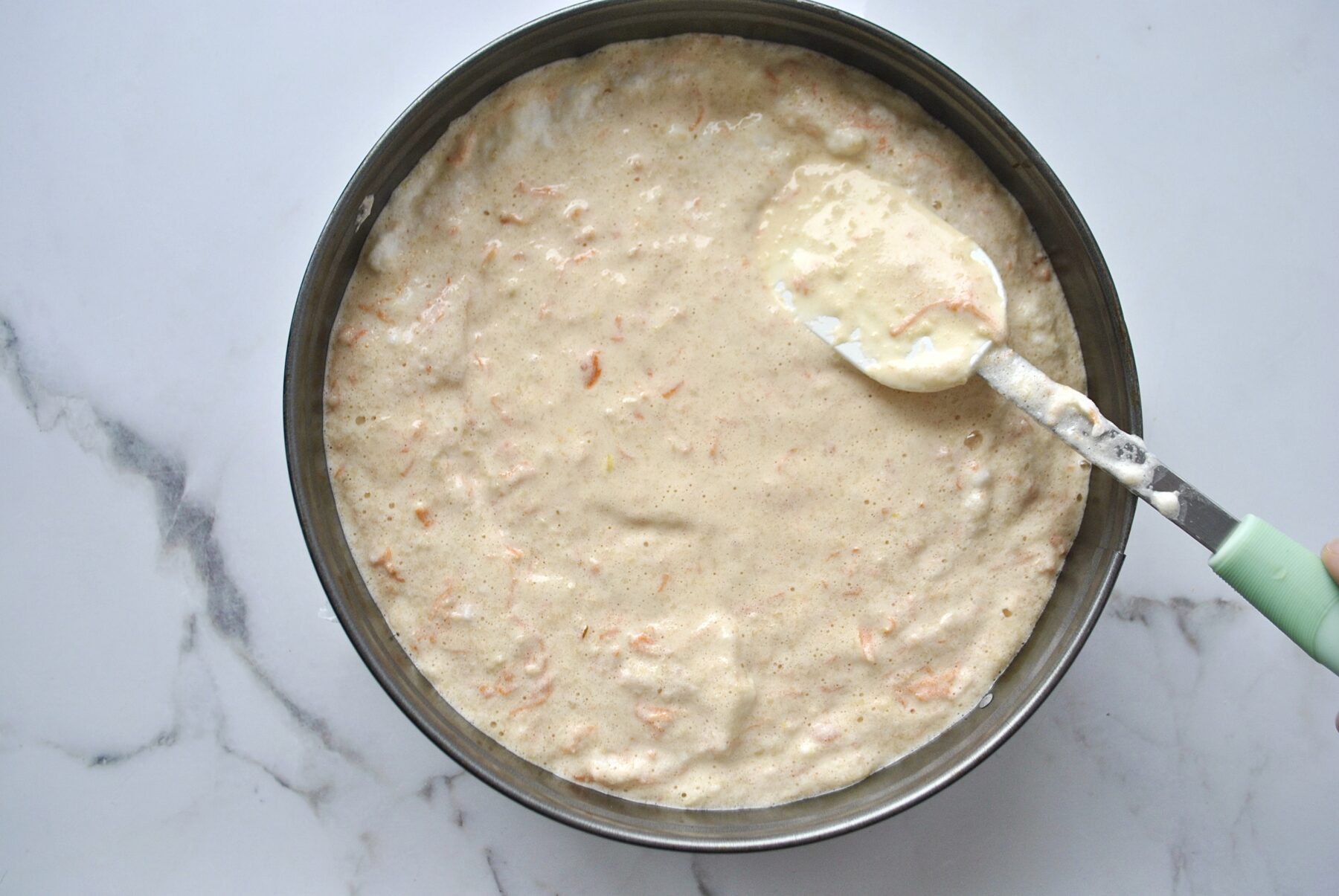 Nun gibst du den Teig in die vorbereitete Springform und streichst die Masse etwas aus. Der Karottenkuchen kommt für ca. 50 Minuten in den Backofen.