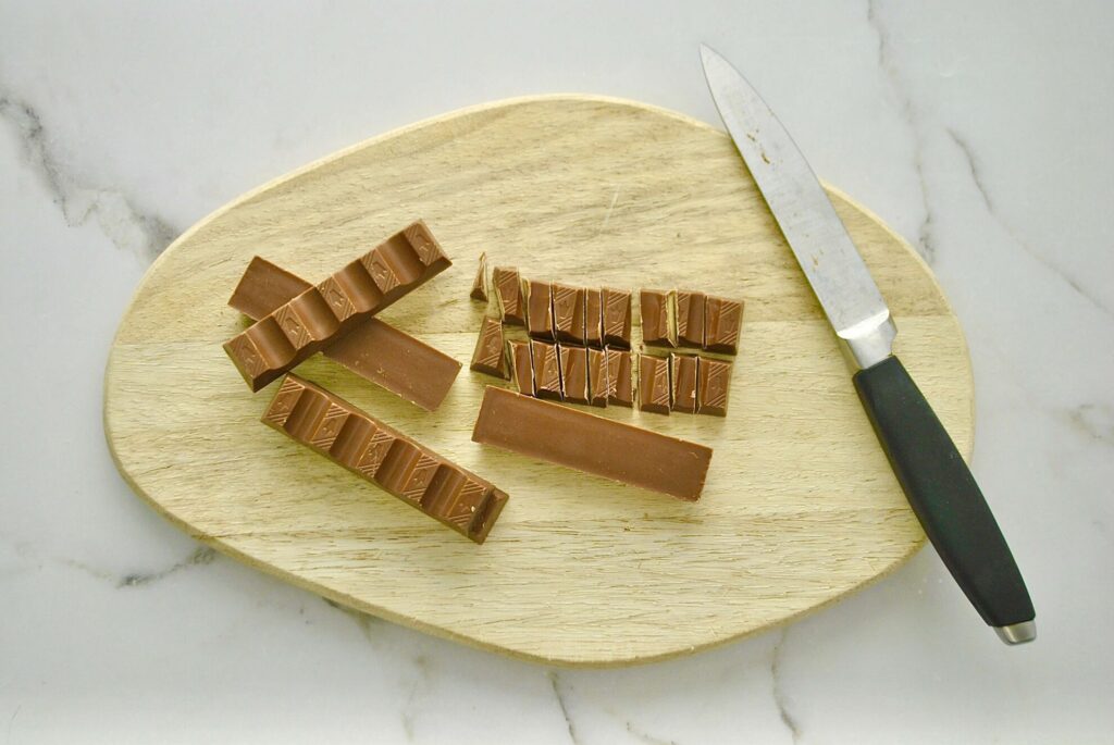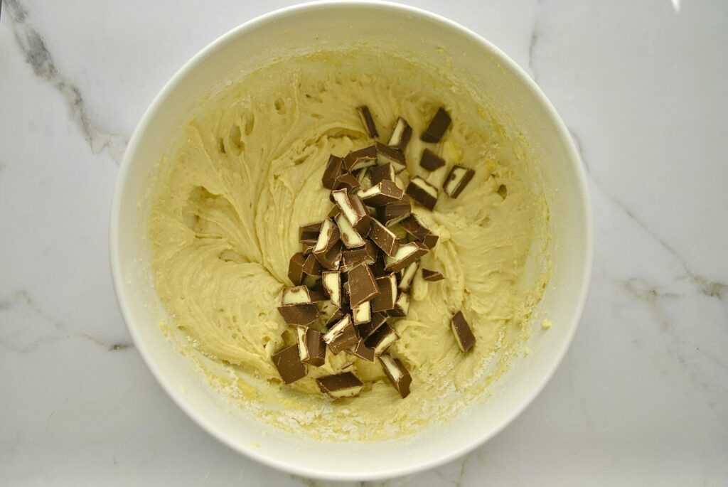 Die Kinderschokolade in gleichmässige Stücke schneiden und unter den Teig heben.