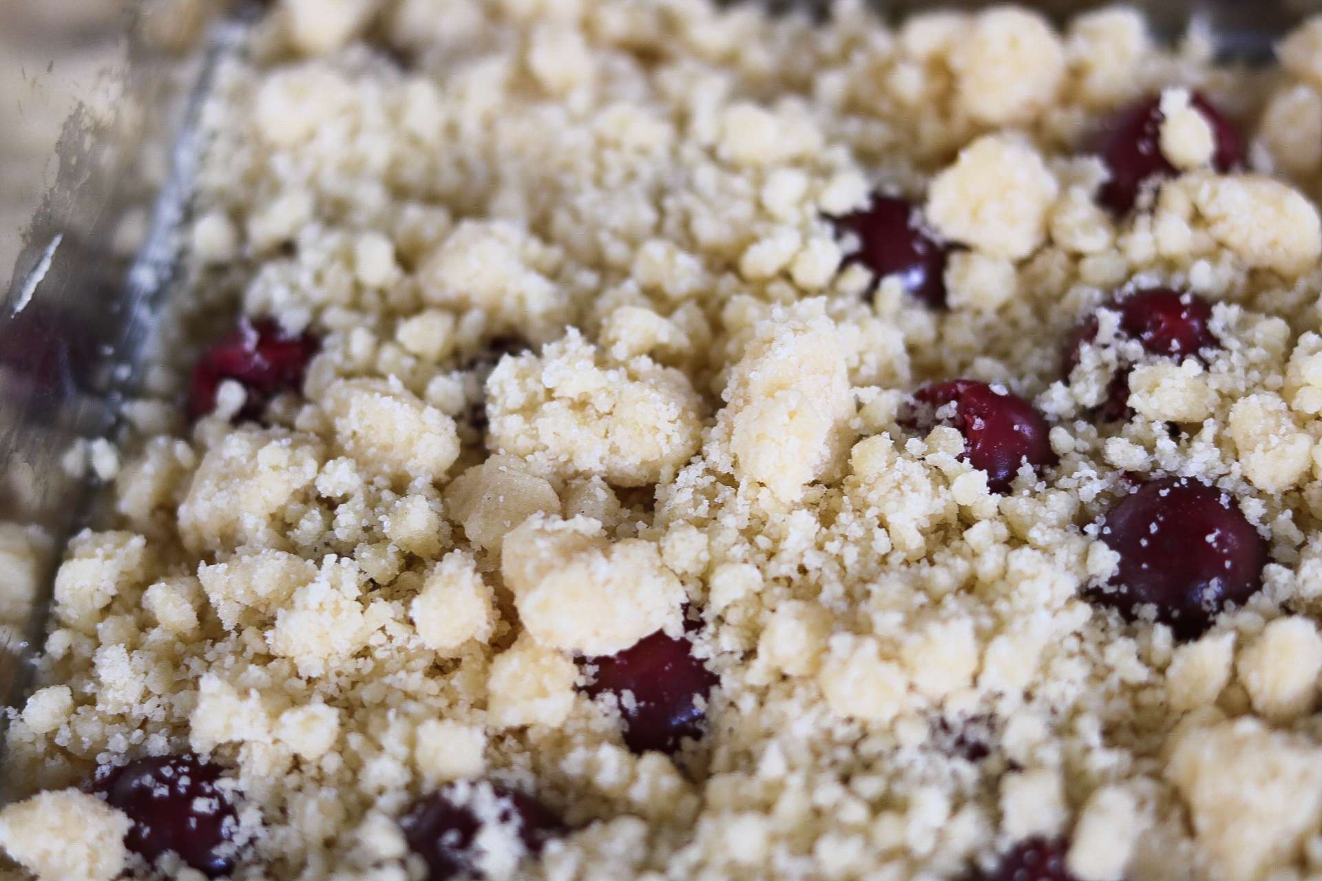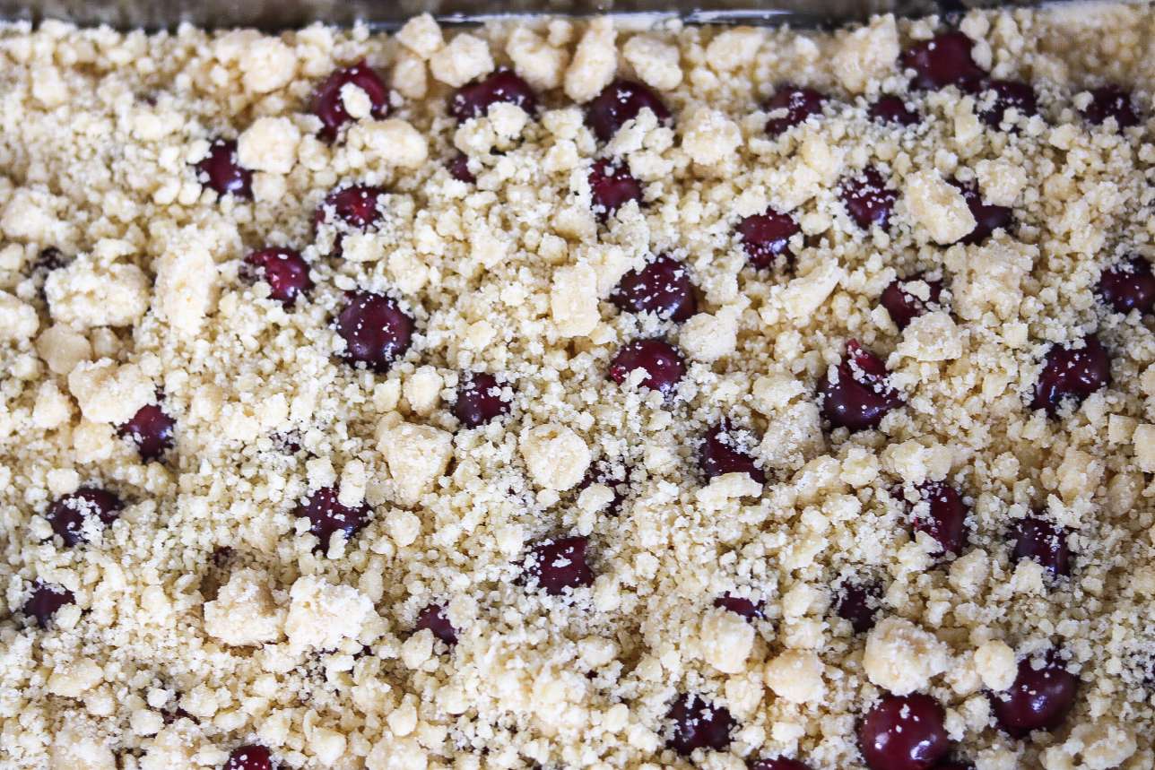 Streusel dann auf den Kirschen gleichmäßig verteilen.