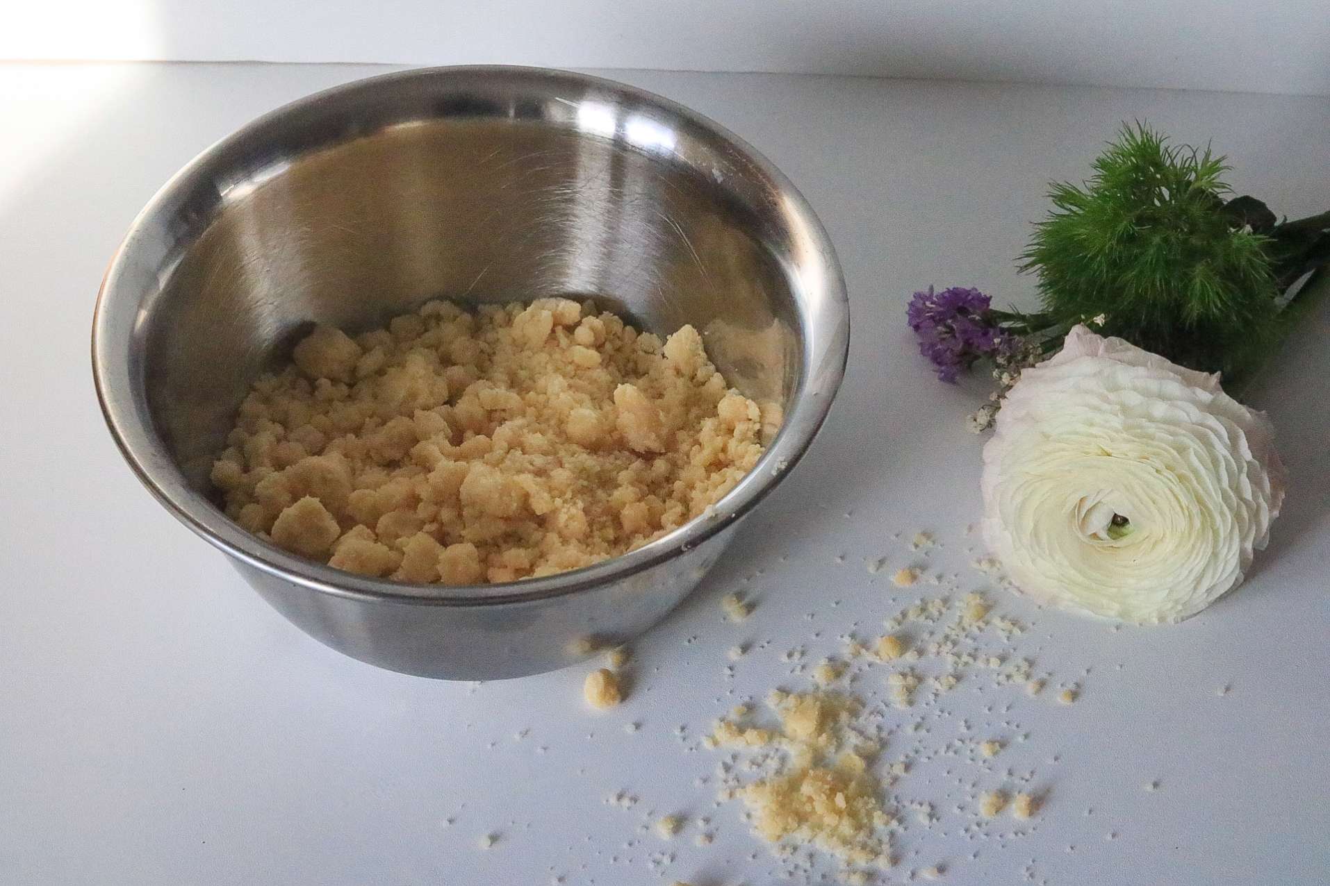 Für die Streusel kalte Butter zusammen mit dem Mehl und dem Zucker in eine Schüssel geben und verkneten bis Streusel entstehen.