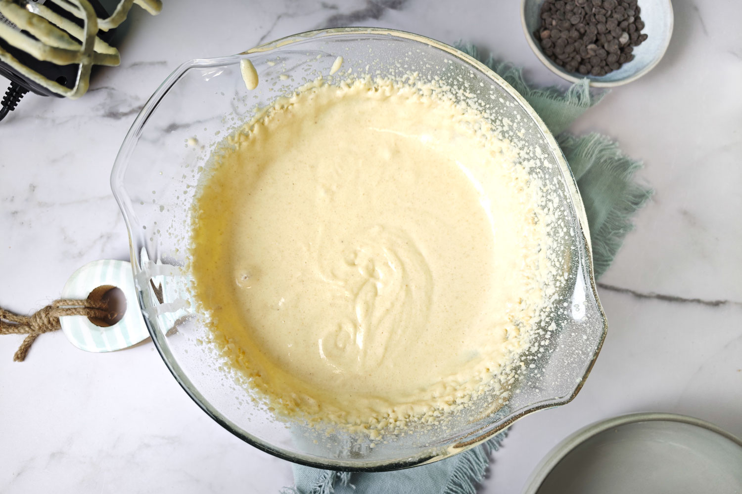 Die trockenen zu den nassen Zutaten in der Schüssel geben. Dann den Zitronensaft dazu geben. Nach und nach die Mandelmilch dazu geben bis ein moussiger Teig entsteht.