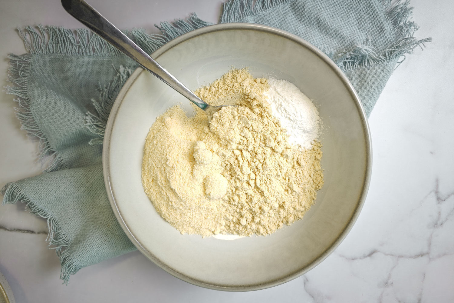 Mandelmehl, Kokosmehl, Flohsamenschalenpulver und Backpulver vermengen.