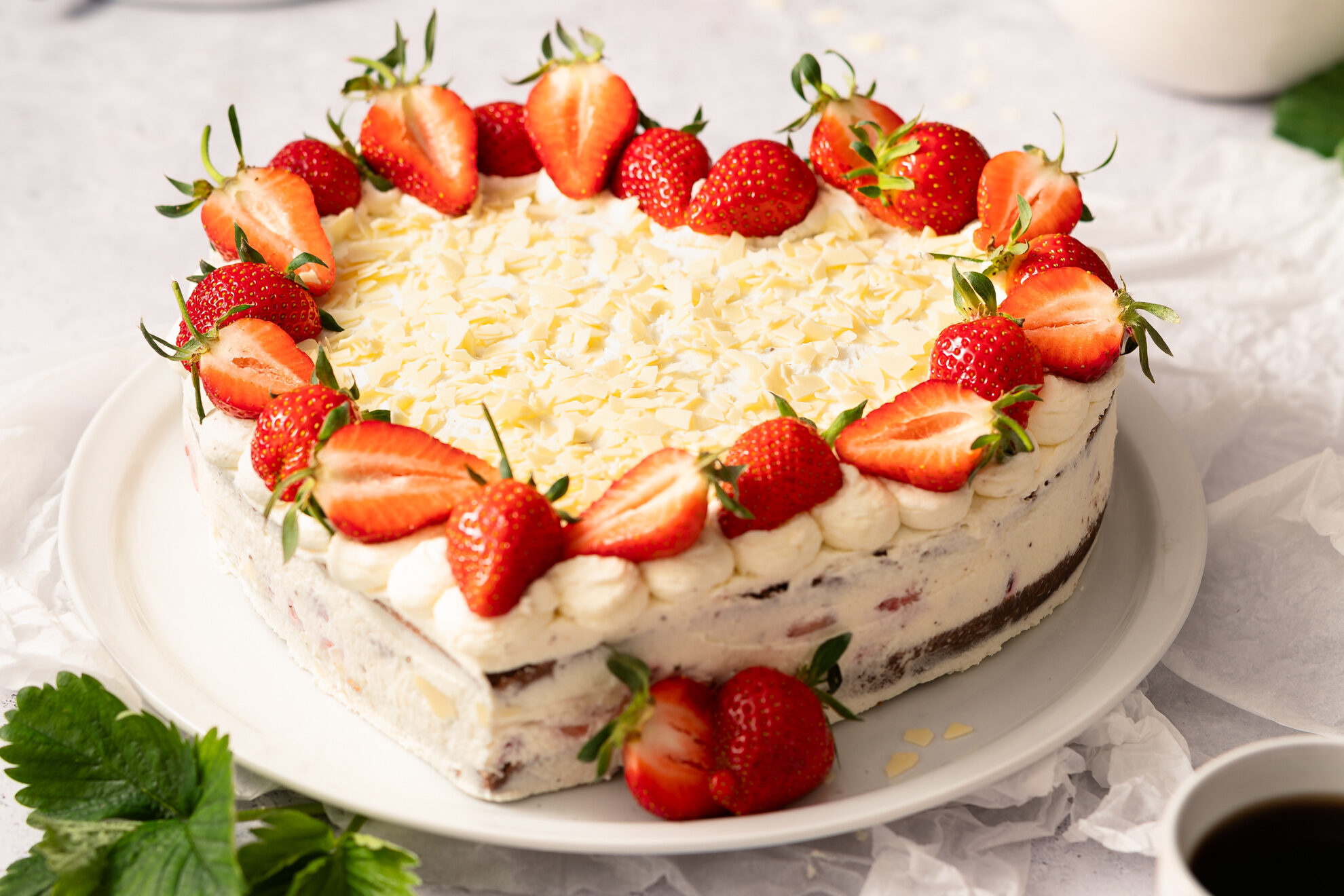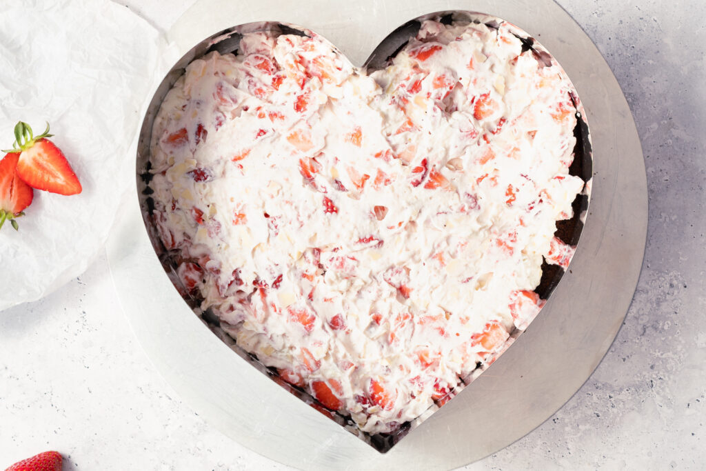 Sahnetupfen rings um das Herz spritzen, mit Erdbeeren belegen und mit weißen Schokoraspeln bestreuen. Bis zum Verzehr kühlen.