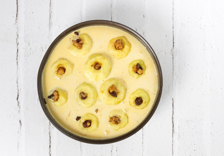 Die vorbereitete Creme wird gleichmäßig über die gefüllten Äpfel in der Springform gegossen. Sie sorgt dafür, dass sich die verschiedenen Komponenten des Kuchens – Mürbeteig, Äpfel und Füllung – harmonisch verbinden und der Kuchen eine cremige, saftige Textur erhält.