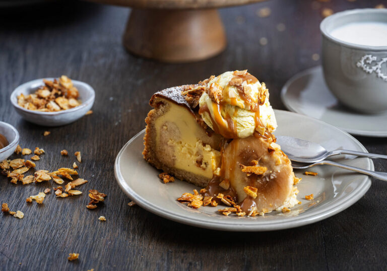 Nach der Backzeit wird der Kuchen aus dem Ofen genommen und kurz abgekühlt, damit sich die Creme setzen kann. Noch lauwarm wird er mit den karamellisierten Mandeln bestreut. Dieser Schritt verleiht dem Kuchen nicht nur eine dekorative Optik, sondern auch einen herrlichen Geschmack und ein angenehmes Mundgefühl. Anschließend kann der Bratapfelkuchen sofort serviert werden – ein perfekter Genuss, der warm besonders aromatisch und einladend wirkt.