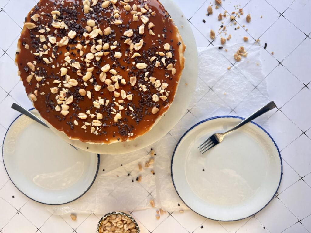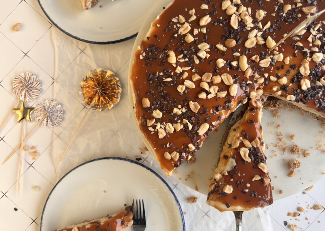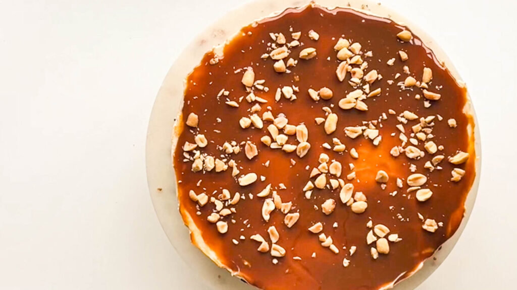 Fertiges Karamell in einem Wasserbad leicht erhitzen und in der Zwischenzeit die Erdnüsse klein hacken. Vor dem Servieren den no -bake Peanutbutter Cheesecake zuerst großzügig mit Karamell garnieren.