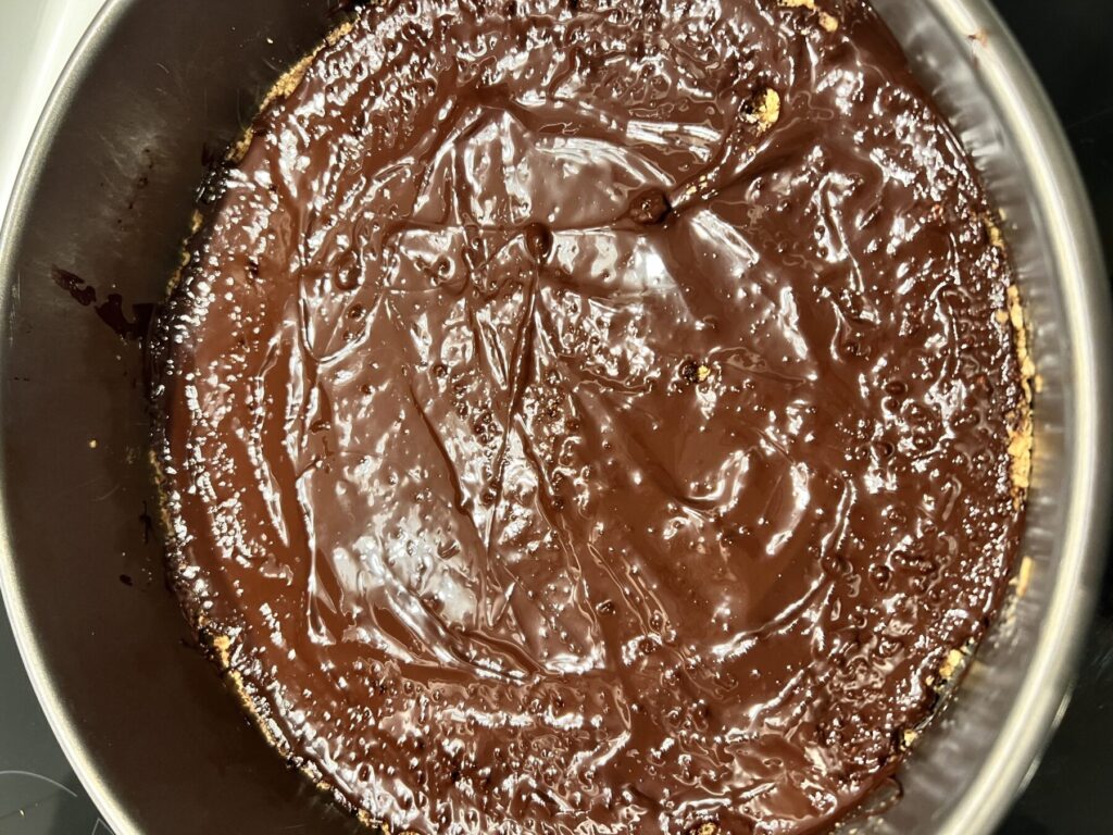 Schokolade schmelzen und auf dem Keksboden verteilen