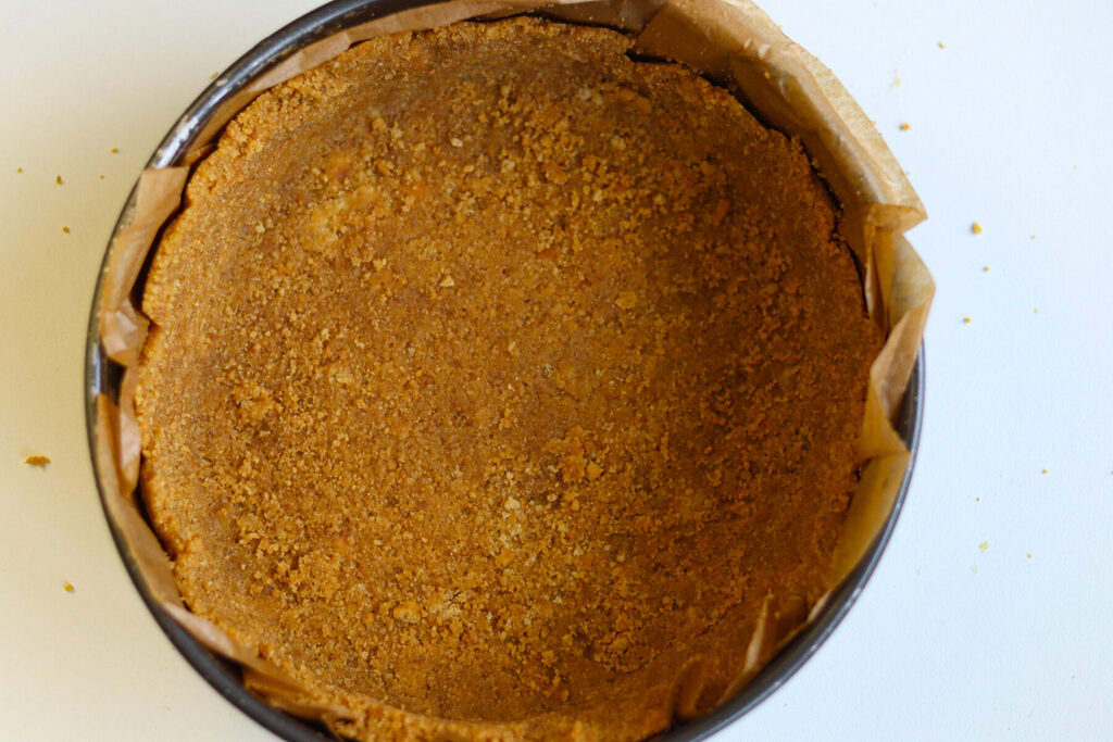 Die Keksmasse auf einer mit Backpapier ausgelegten Springform verteilen. Mit einem Löffelrücken fest andrücken und in den Kühlschrank stellen.