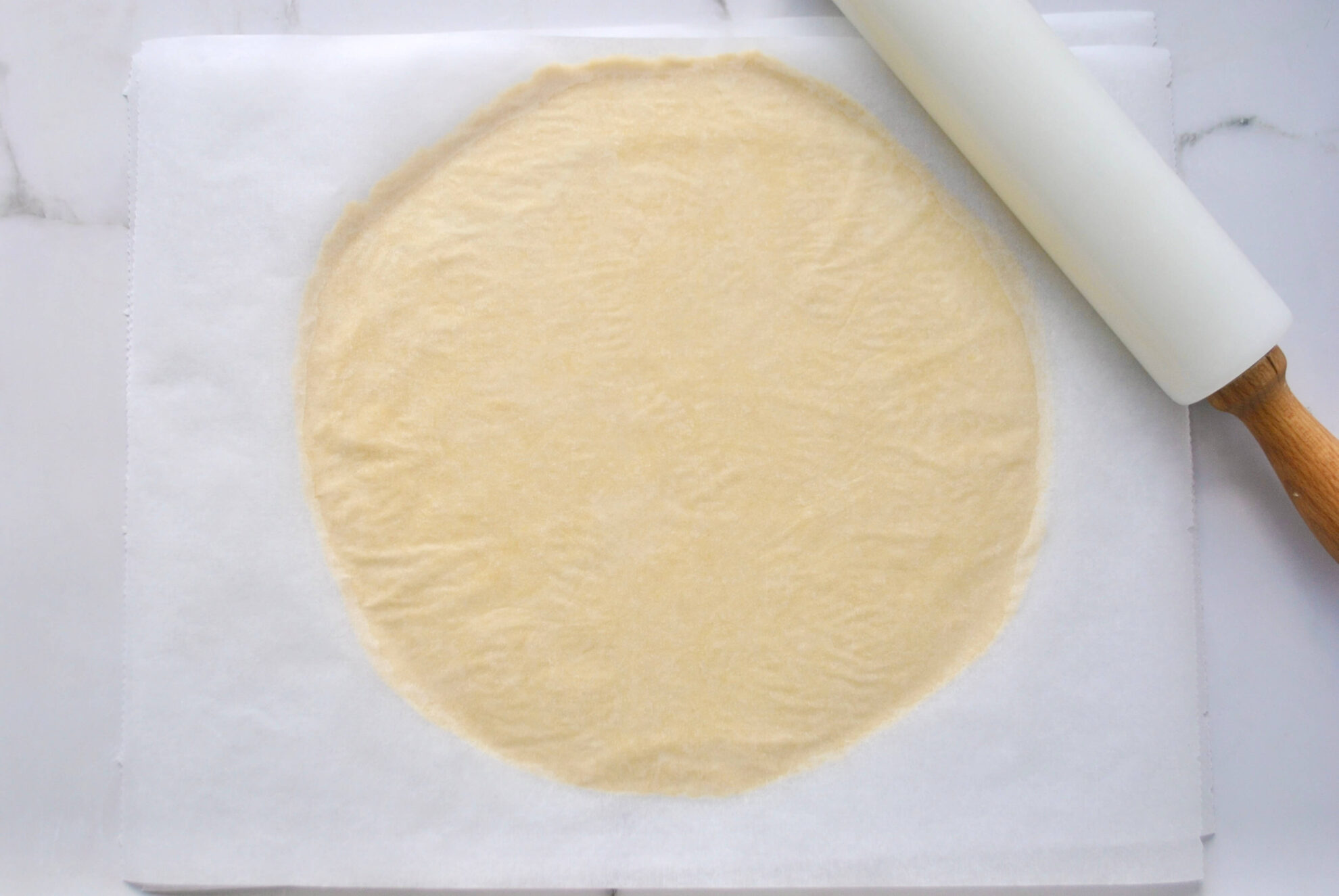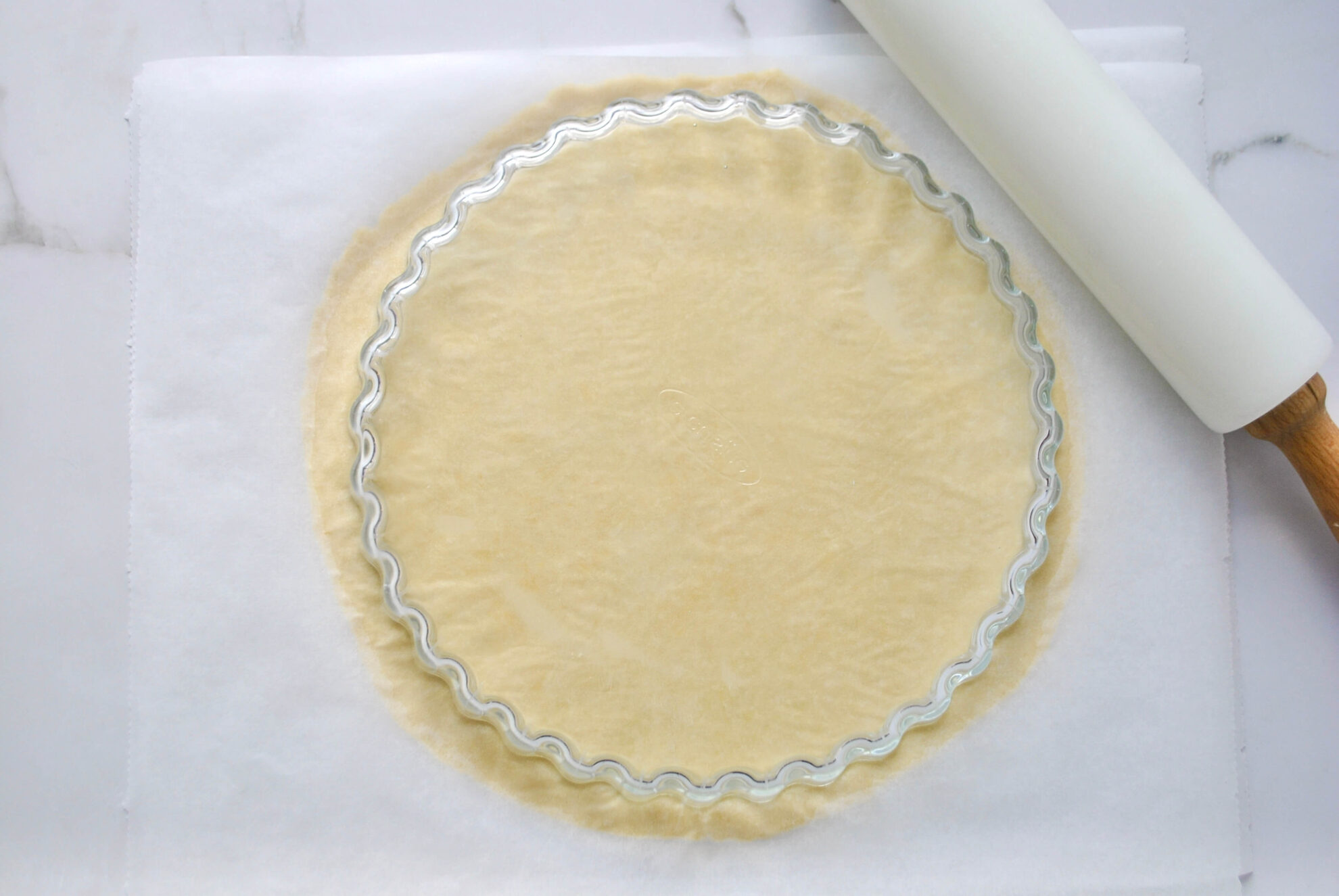 Auswallen: Den gekühlten Teig zwischen zwei Backpapierbögen dünn auswallen. So erhält die Quiche einen gleichmäßig dicken Boden und Rand. Ideal, wenn du präzise Ränder und ein sauberes Finish möchtest.