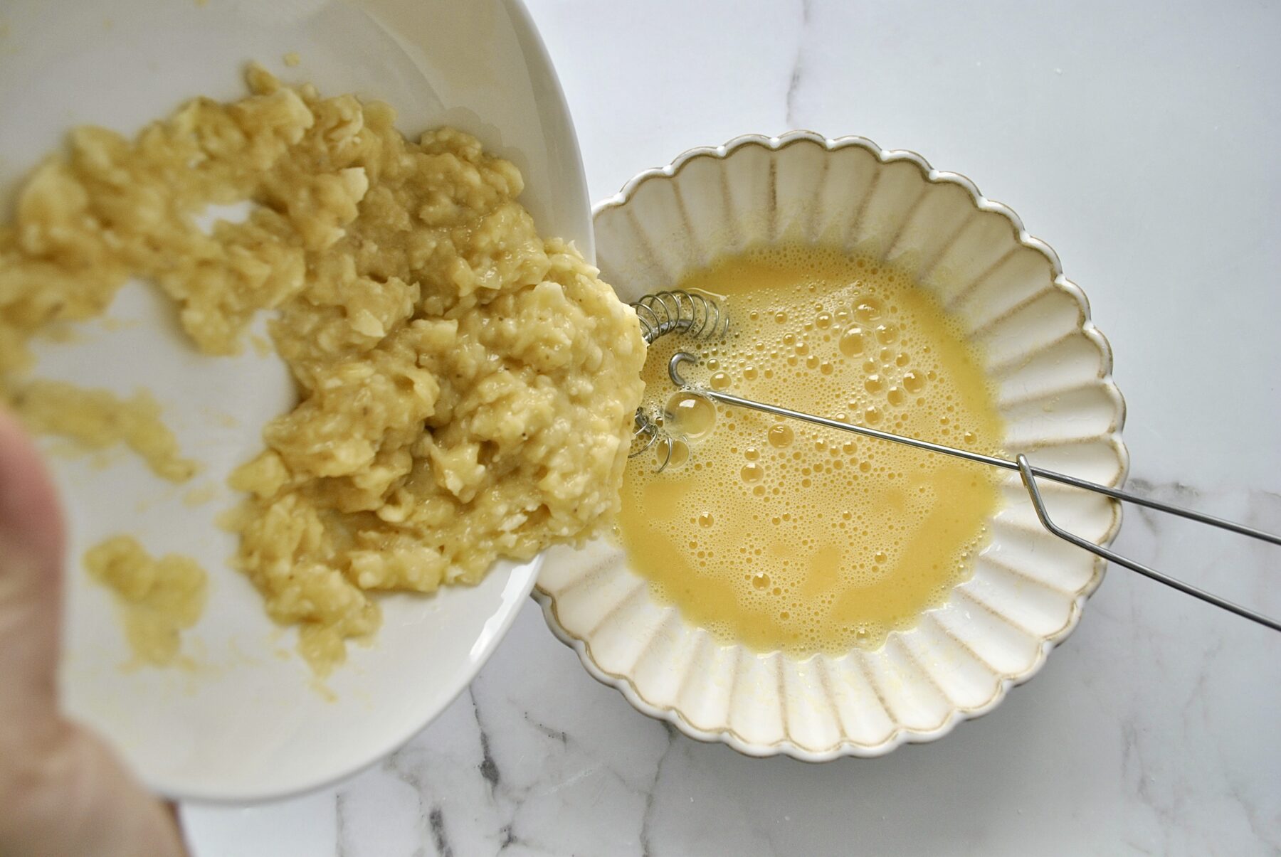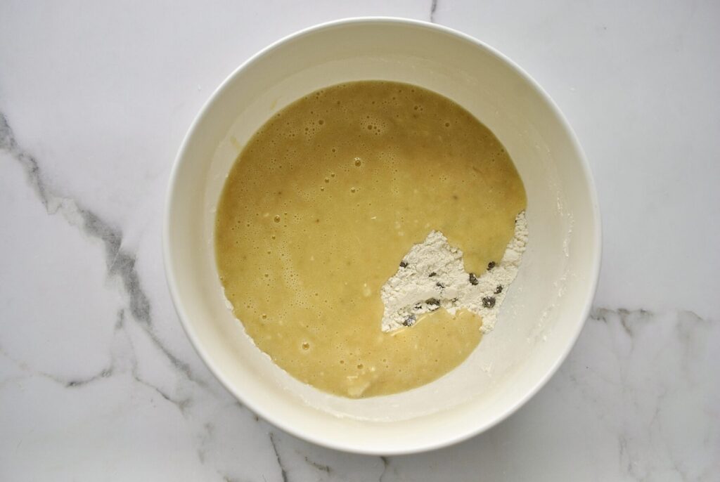 Den Bananenbrei geben wir nun zum Eier-Öl Gemisch hinzu und vermengen sie kurz.