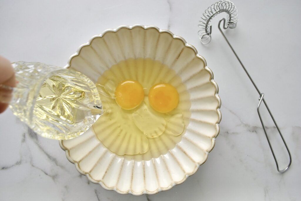 Danach vermengen wir die Eier zusammen mit dem Öl in einer separaten Schüssel.