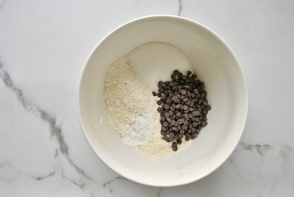 Zuerst mischen wir in einer Rührschüssel alle trockenen Zutaten wie Mehl, Backpulver, Salz, Zucker und Schokodrops.