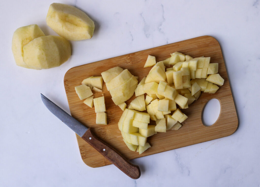Im nächsten Schritt schälst Du die Äpfel, entkernst und viertelst sie. Schneide sie nun in kleine Würfel. Da kannst Du nach Deinem persönlichen Geschmack variieren. Bei kleineren Kindern kannst Du die Stücke auch kleiner machen.